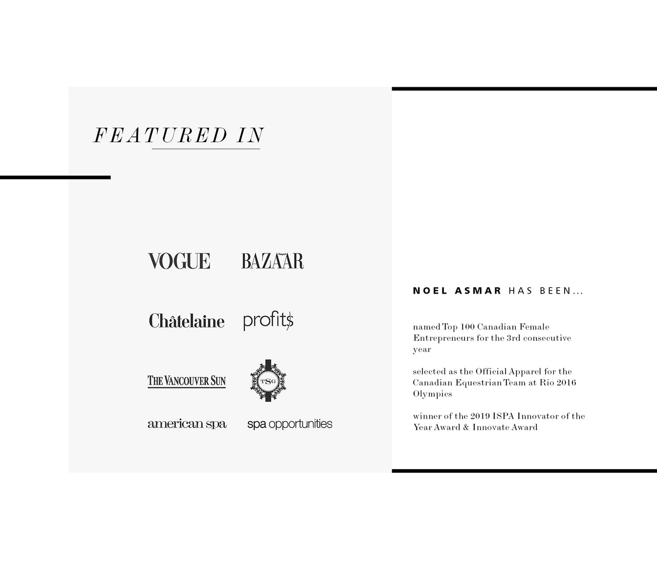 Noel’s deep connection to the wellness community, strengths as a leader, and desire to give back, has fueled her desire to keep innovating for the growth and empowerment of the practitioners that dedicate their lives to caring for others. She has taken an active role in with various professional organizations, including the International Spa Association, where she sat on the board of directors for six years. Her work continues to receive international attention, with features in Harper’s Bazaar and Vogue, while Noel’s creativity, innovation, and business savvy have seen her recognized as one of Canada’s Top 20 Female Entrepreneurs and awards for innovation and sustainability.