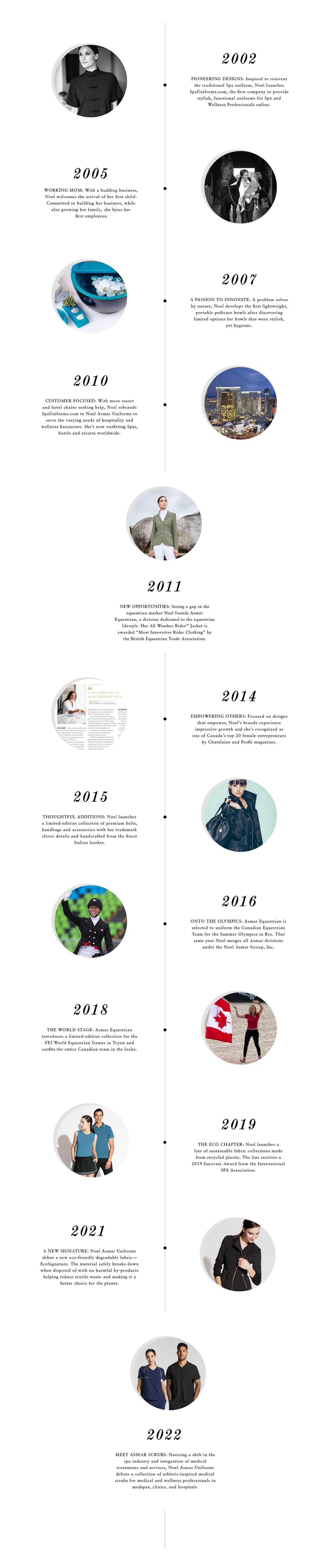 Beginning her career in hospitality, Noel spent a decade overseas drawn in by a passion for languages, cultures, art, fashion, and flavors. Upon returning to Canada, she launched Noel Asmar Uniforms—the first designer spa uniform—in 2002.